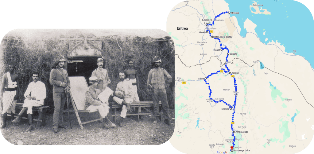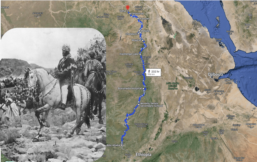 ዐፄ ምኒልክ ጦራቸውን ከመቀሌ አንስተው ወደ ሐውዜን ፣ ከሐውዜን ወደ ፈረስ ማይ ፣ ከፈረስ ማይ ወደ ሳውርያ ከዚያም ወደ ዐድዋ ታጥፈው የጦር ሰፈራቸውን የሐ የሚባለው ሥፍራ አድርገዋል።